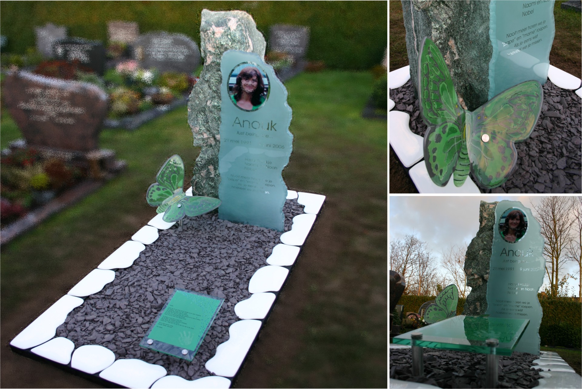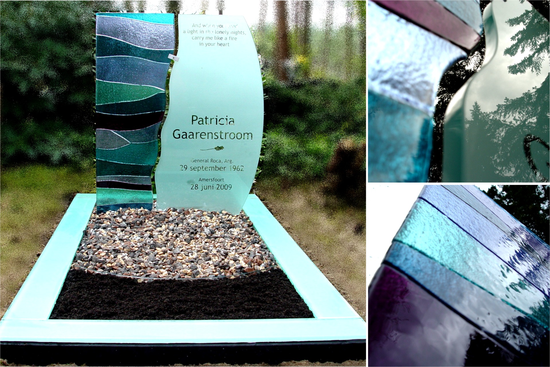 De veelzijdigheid van glas en de combinatie mogelijkheden met andere materialen maakt een grote variƫteit aan gedenktekens mogelijk. Dit geeft Artiverre de inspiratie voor het ontwerpen van unieke gedenktekens, waarbij de aard van het materiaal, de kleur en de uiteenlopende bewerkingstechnieken alle ruimte laten voor een individuele invulling. Een grafmonument markeert niet alleen de laatste rustplaats van de overledene maar weerspiegelt de boodschap en erkenning van een geliefd mens. In samenspraak met de nabestaanden maakt Artiverre een uniek gedenkteken uit materialen die passen bij de herinneringen aan jouw dierbare en aansluiten bij de persoonlijke wensen.