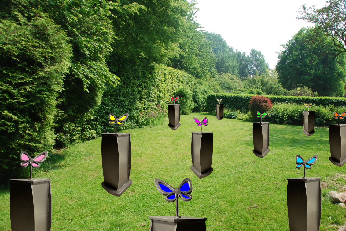 Iedere zuil is standaard uitgerust voor drie urnen. Voor de kunstuiting aan de bovenzijde van iedere zuil beschikken wij over een aantal standaard symbolen. Dit kan een vlinder van gekleurd glas zijn of bijvoorbeeld een zon. Mocht u een eigen ontwerp willen dan gaan we daar uiteraard mee aan de slag, mits het technische haalbaar en verantwoord is.De urnzuilen zijn flexibel te plaatsen waardoor ze op vele plekken op een begraafplaats inzetbaar zijn. Dat kan een bosrijke plaats met veel bomen zijn of een heuvelachtig terrein met struiken en heide, ze passen overal tussen.